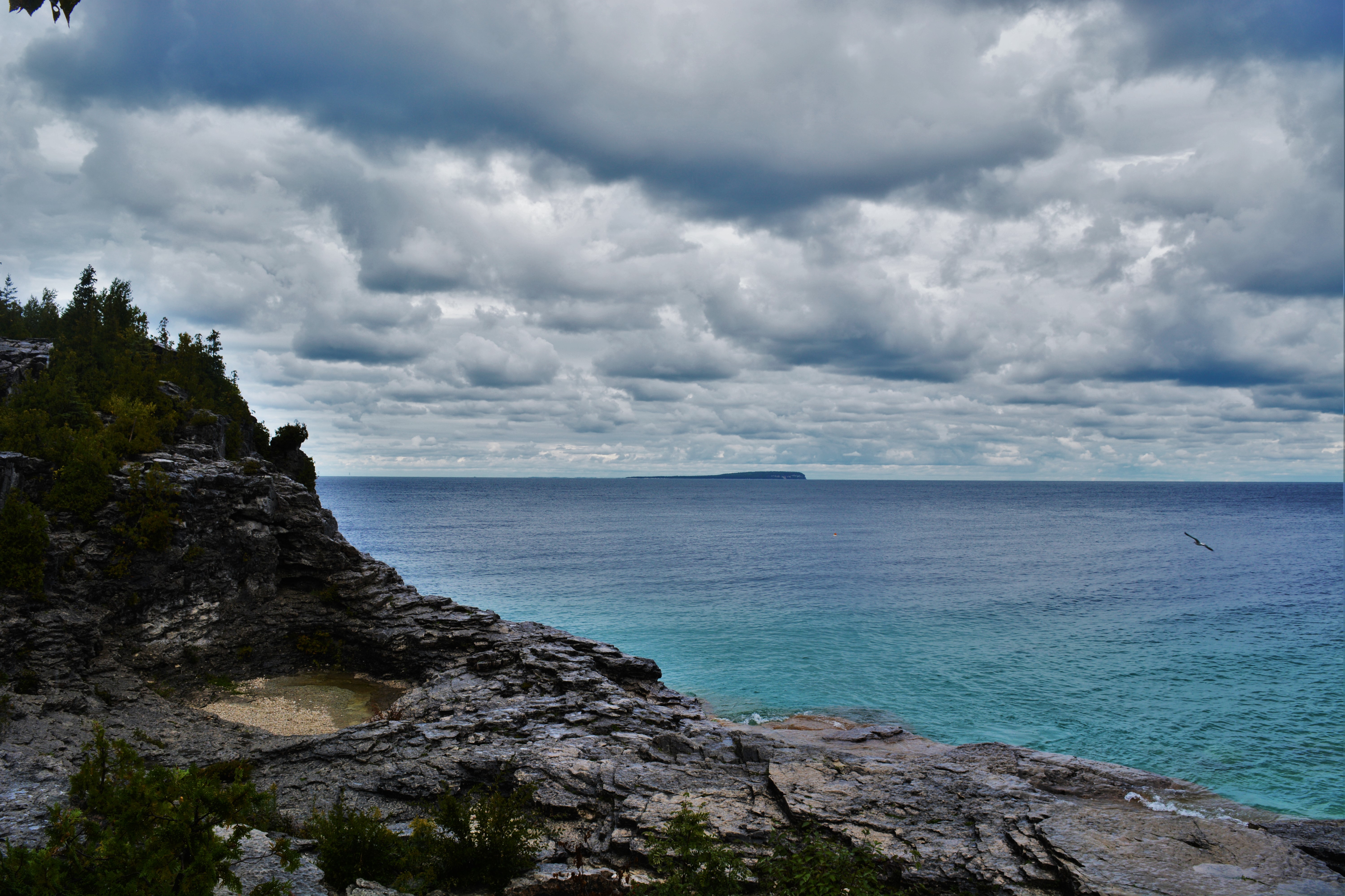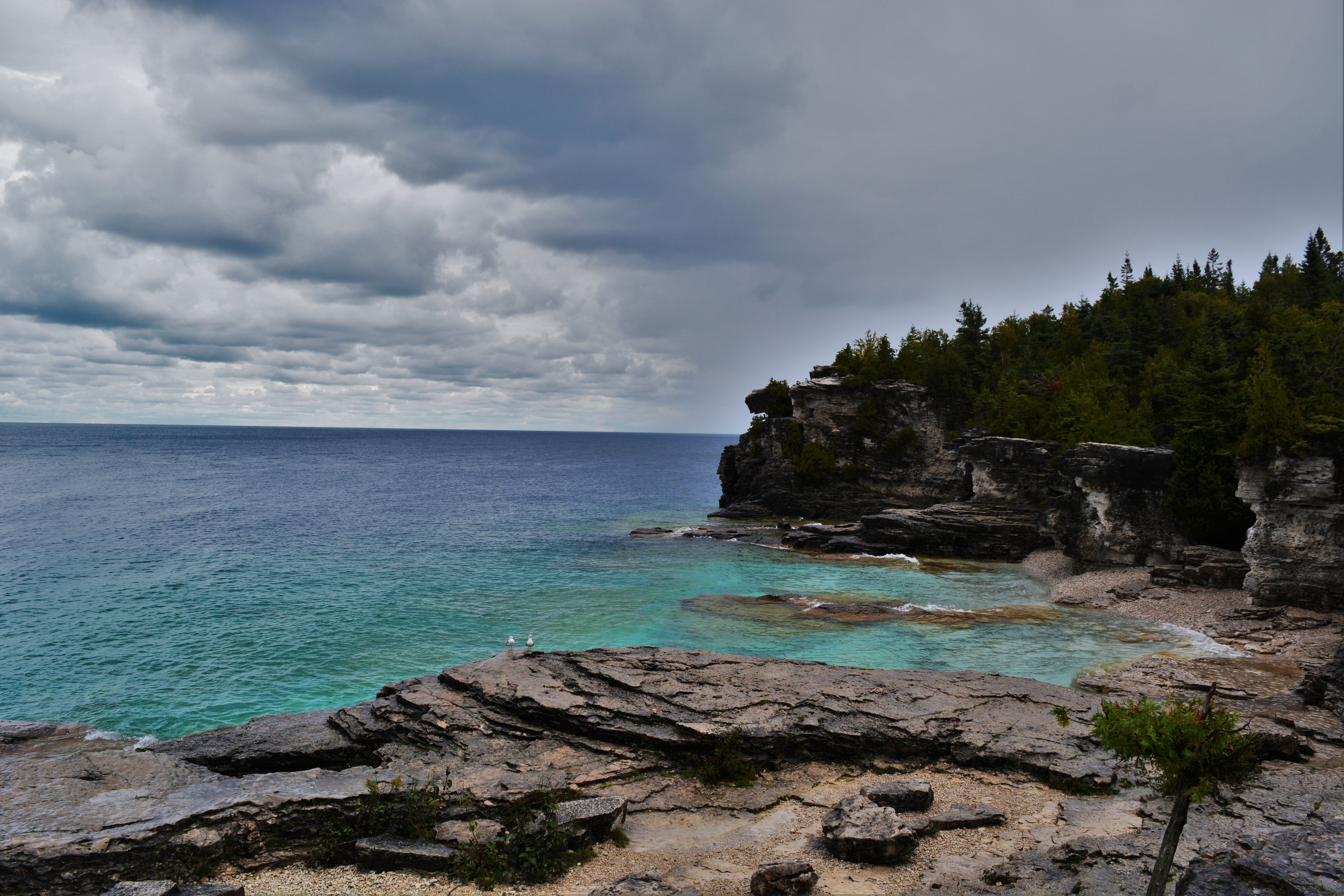 Puisque la pluie était à l’honneur lors de notre périple dans la baie Georgienne, nous avons malheureusement été limités au niveau des randonnées. Nous nous sommes toutefois aventurés dans le parc national de la Péninsule-Bruce pour y faire une randonnée d’une trentaine de minutes menant à une formation rocheuse très populaire, The Grotto. Il s’agit d’une grotte ayant été formée par les vagues de la baie Georgienne il y a de cela des milliers d’années. On y retrouve une vue à couper le souffle avec comme décor une eau nous rappelant les couleurs éclatantes des Caraïbes.