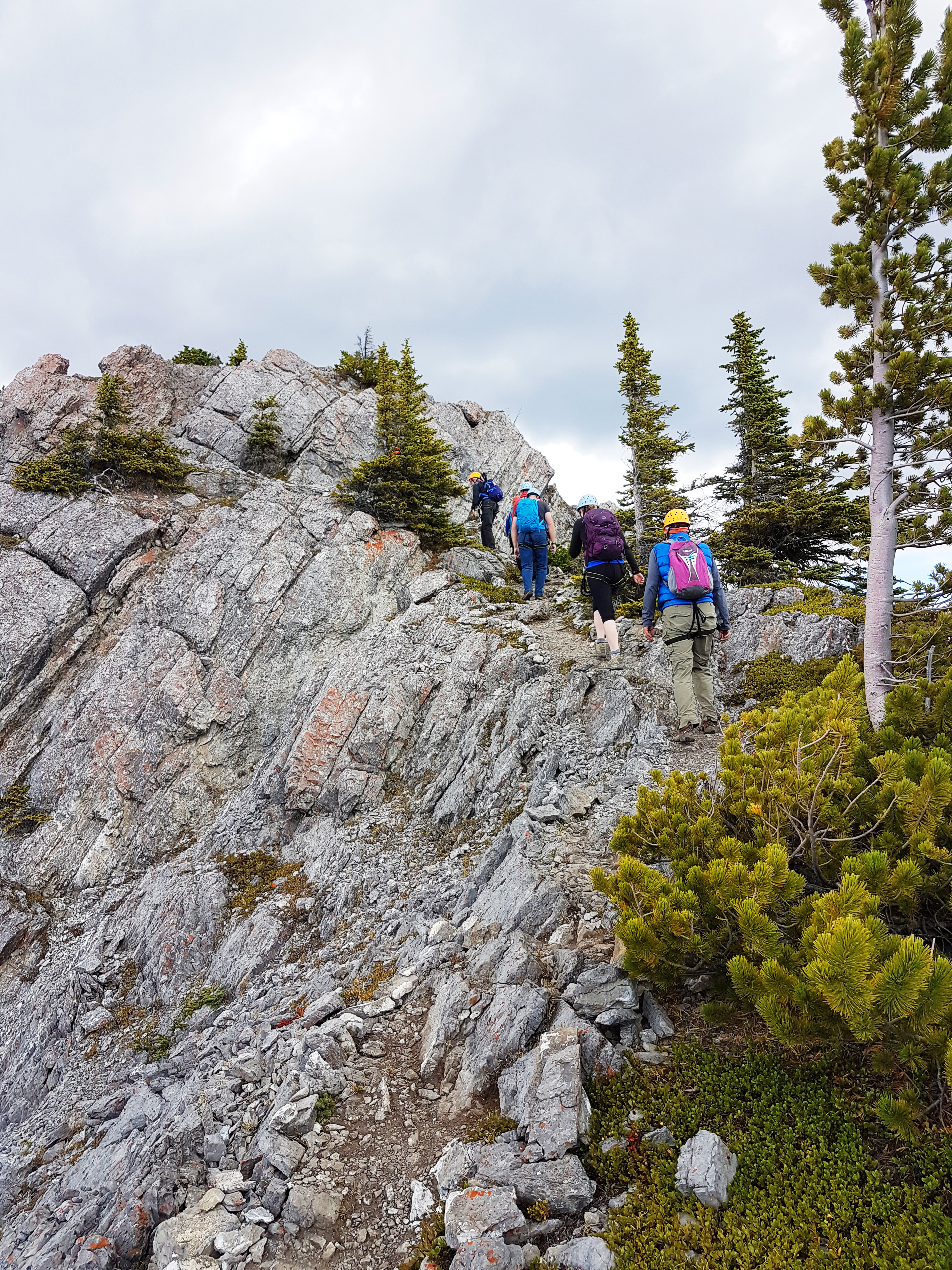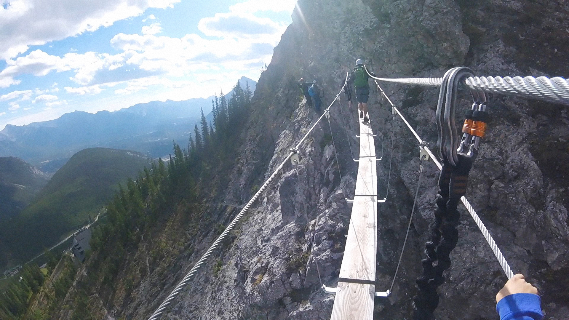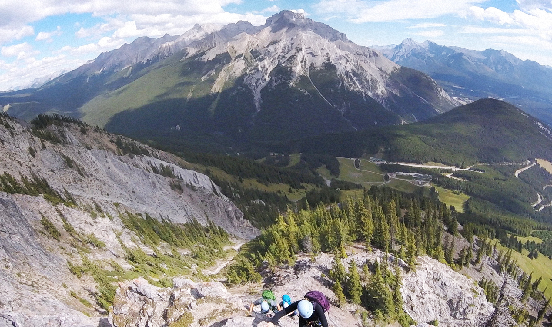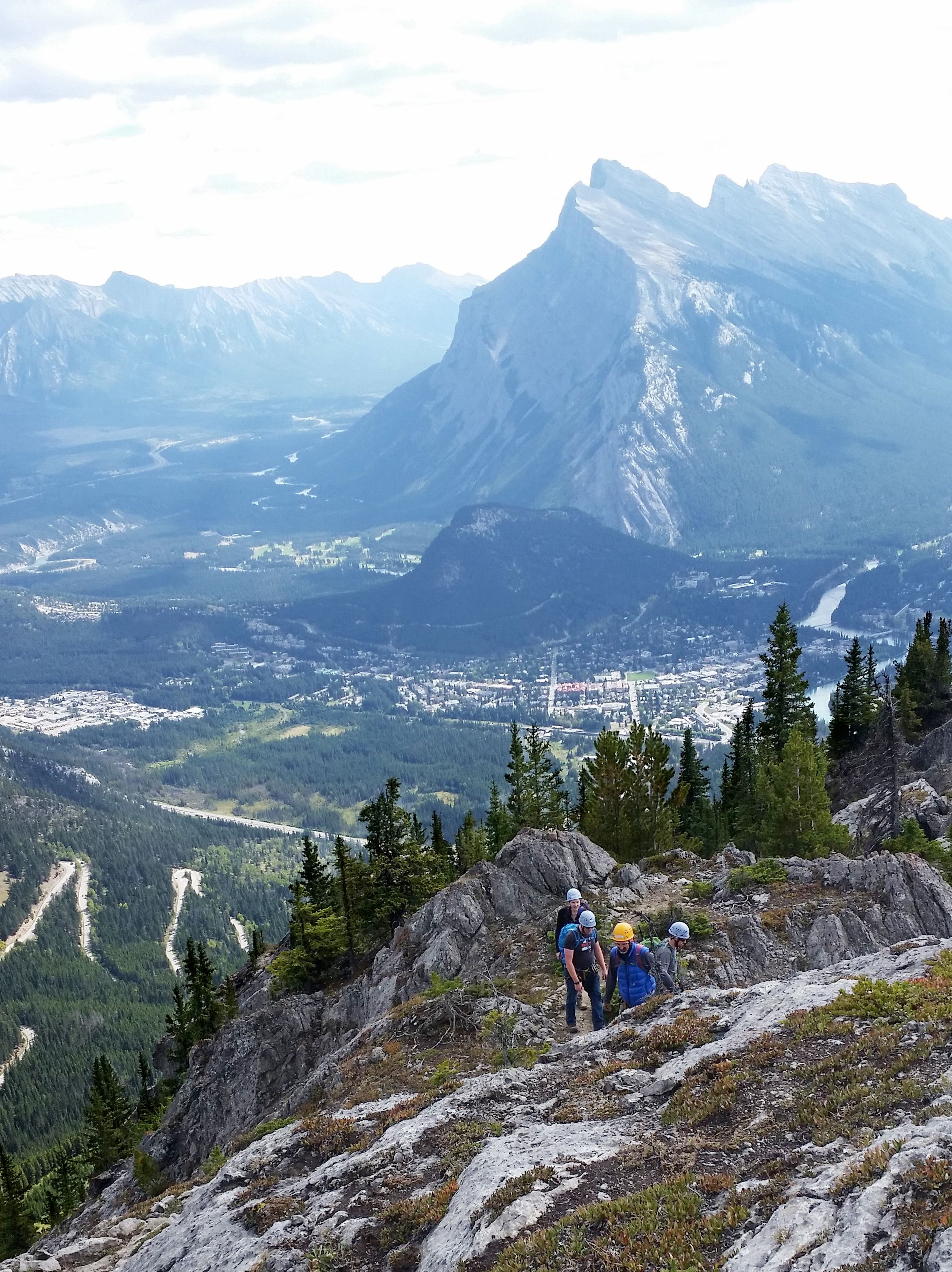 Il est permis d’arrêter en cours de route pour prendre des photos lorsque l’on juge qu’on ne retardera pas trop le restant du groupe (tenez bien vos appareils photo !) et quinze minutes nous ont été allouées pour manger une collation un peu avant d’arriver en haut. La vue du sommet est plus qu’incroyable ! Quelques pas sur la crête nous permettent d’observer la ville de Banff, en plus d’un énorme ravin sur un côté et les parcours de Via Ferrata qui se dessinent au loin vers le bas de l’autre côté. La descente se fait par un autre sentier plutôt escarpé qui exige que l’on soit attachés quelques fois pour éviter de tomber.
