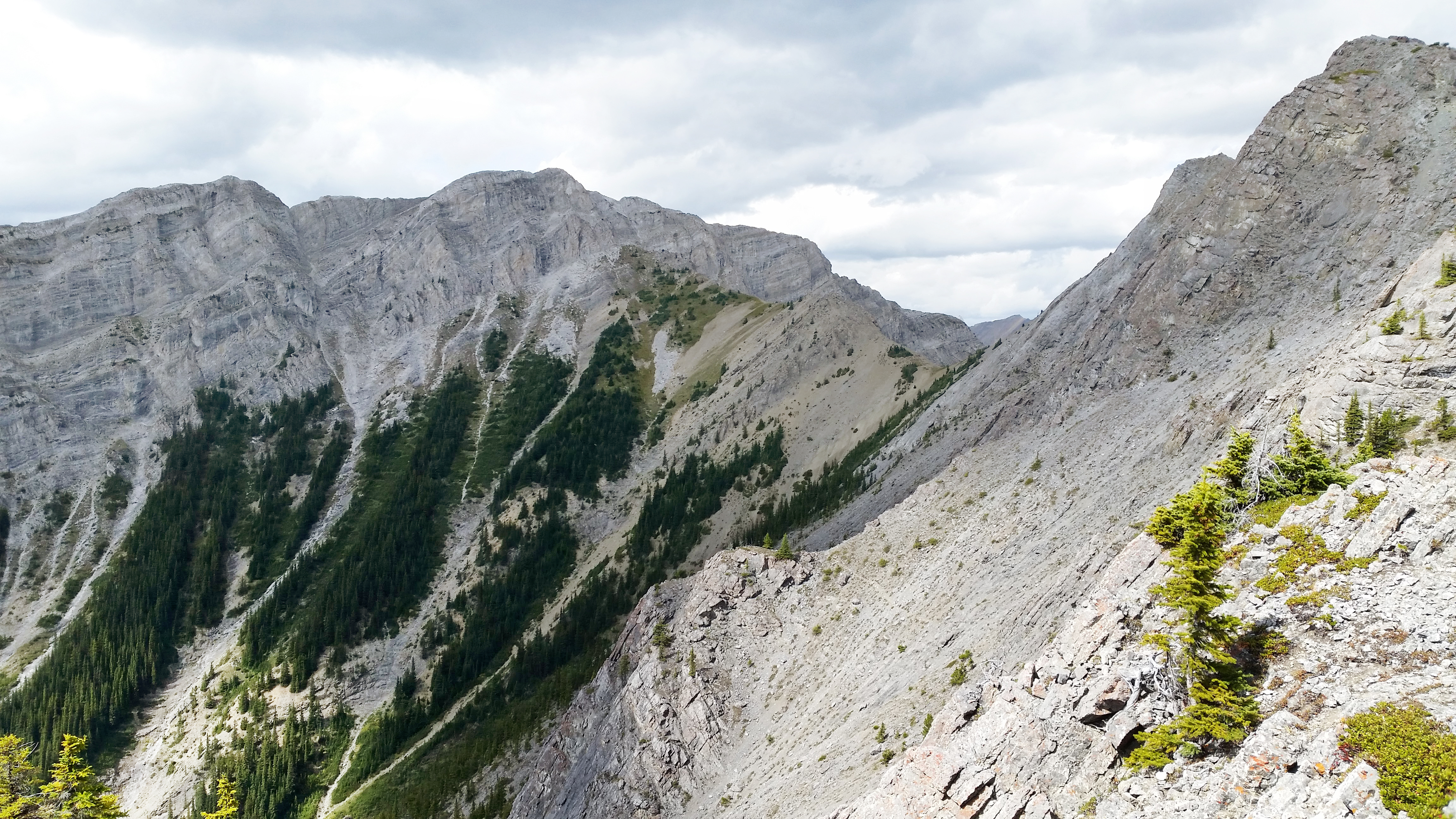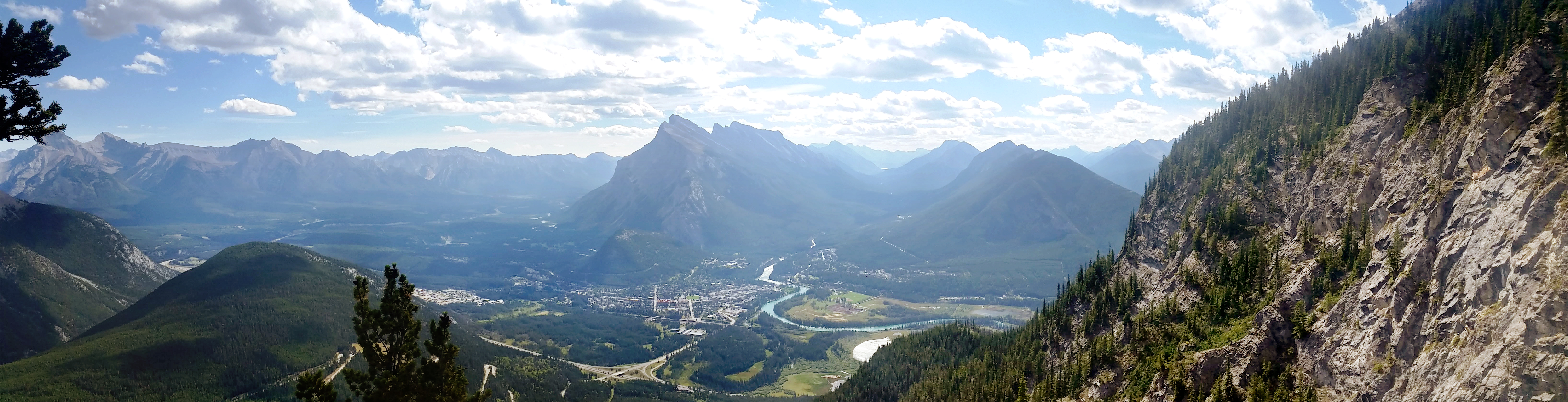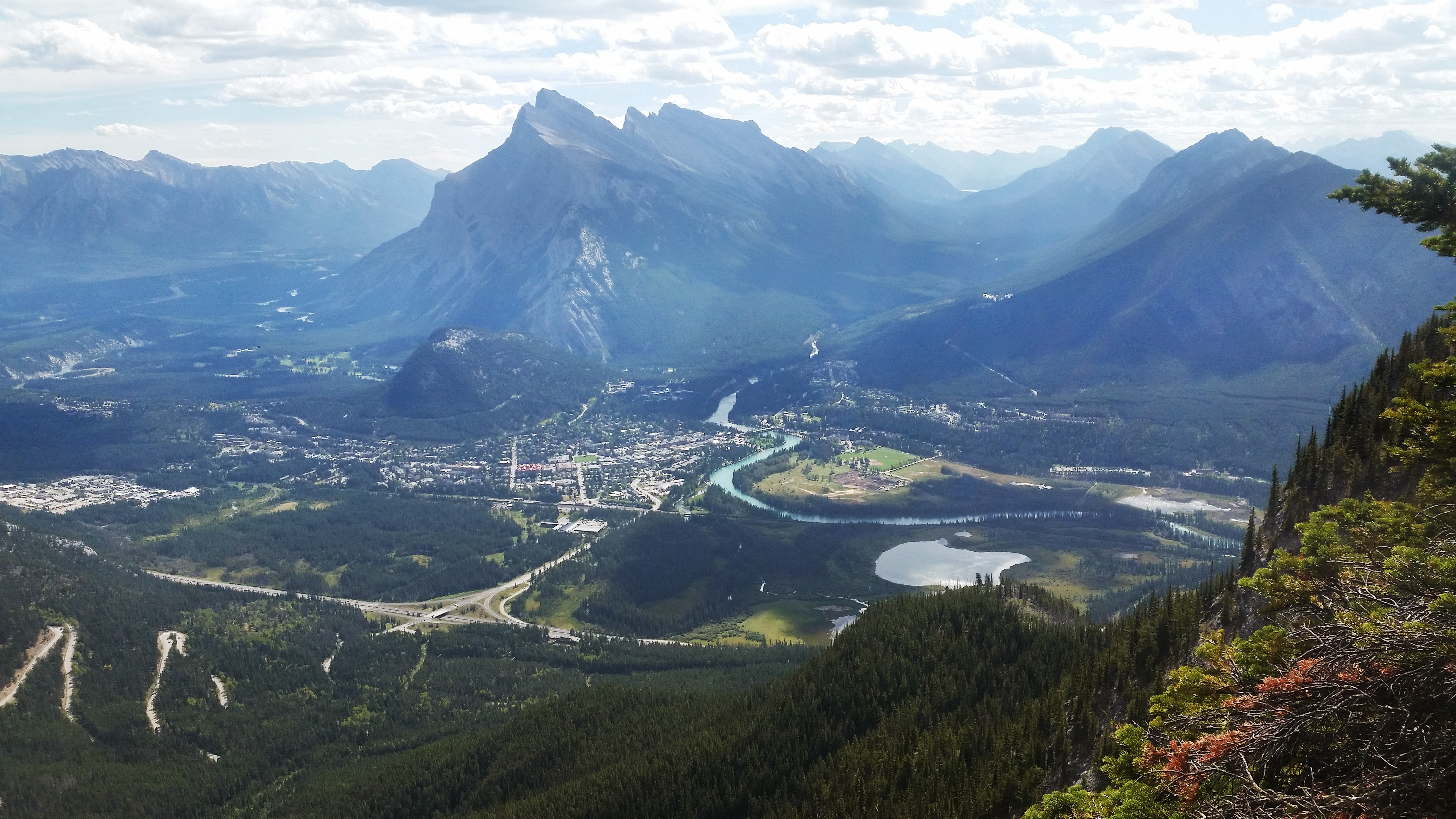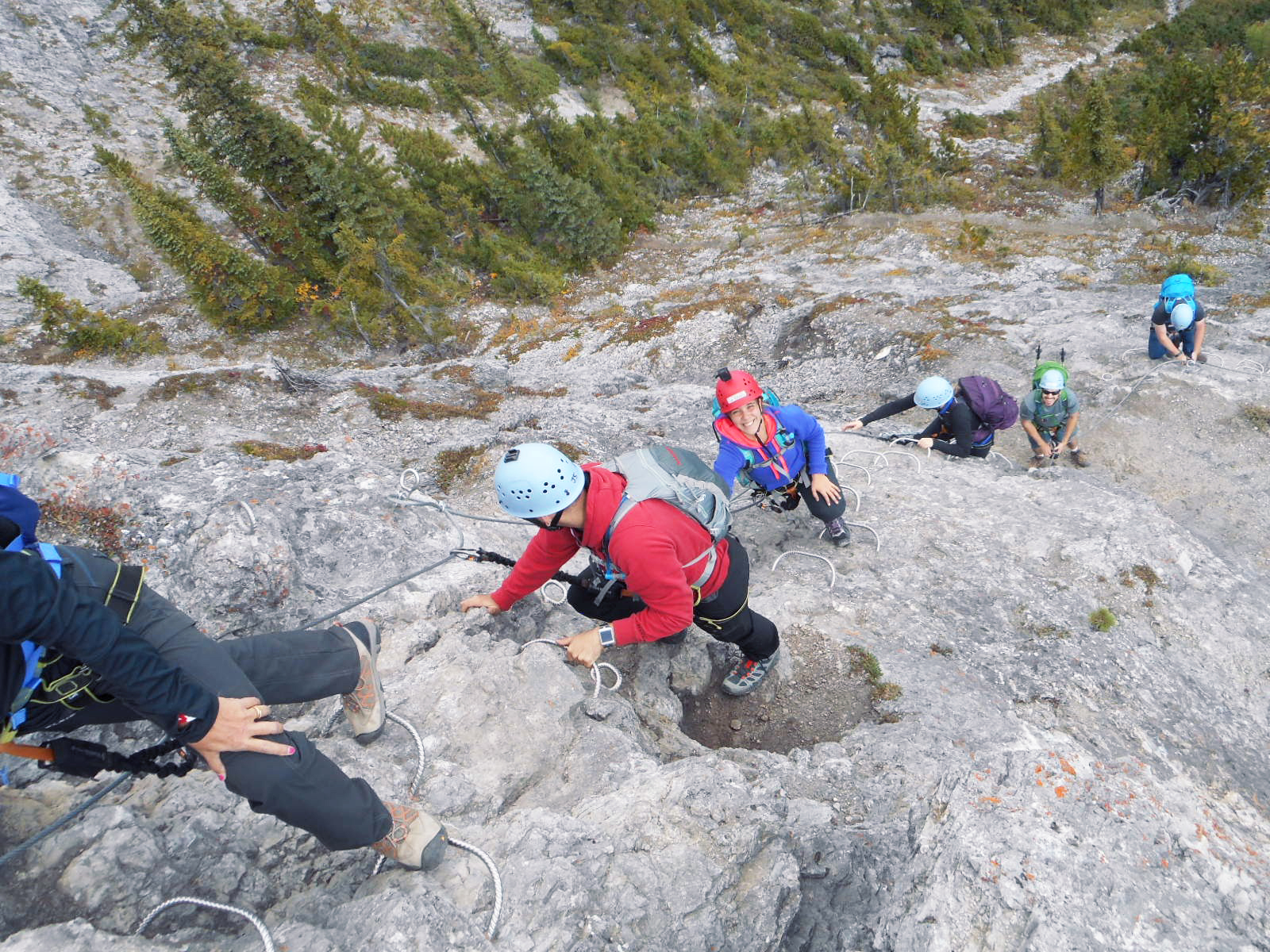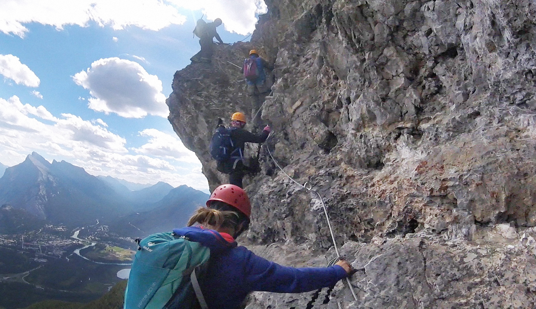 Il est permis d’arrêter en cours de route pour prendre des photos lorsque l’on juge qu’on ne retardera pas trop le restant du groupe (tenez bien vos appareils photo !) et quinze minutes nous ont été allouées pour manger une collation un peu avant d’arriver en haut. La vue du sommet est plus qu’incroyable ! Quelques pas sur la crête nous permettent d’observer la ville de Banff, en plus d’un énorme ravin sur un côté et les parcours de Via Ferrata qui se dessinent au loin vers le bas de l’autre côté. La descente se fait par un autre sentier plutôt escarpé qui exige que l’on soit attachés quelques fois pour éviter de tomber.