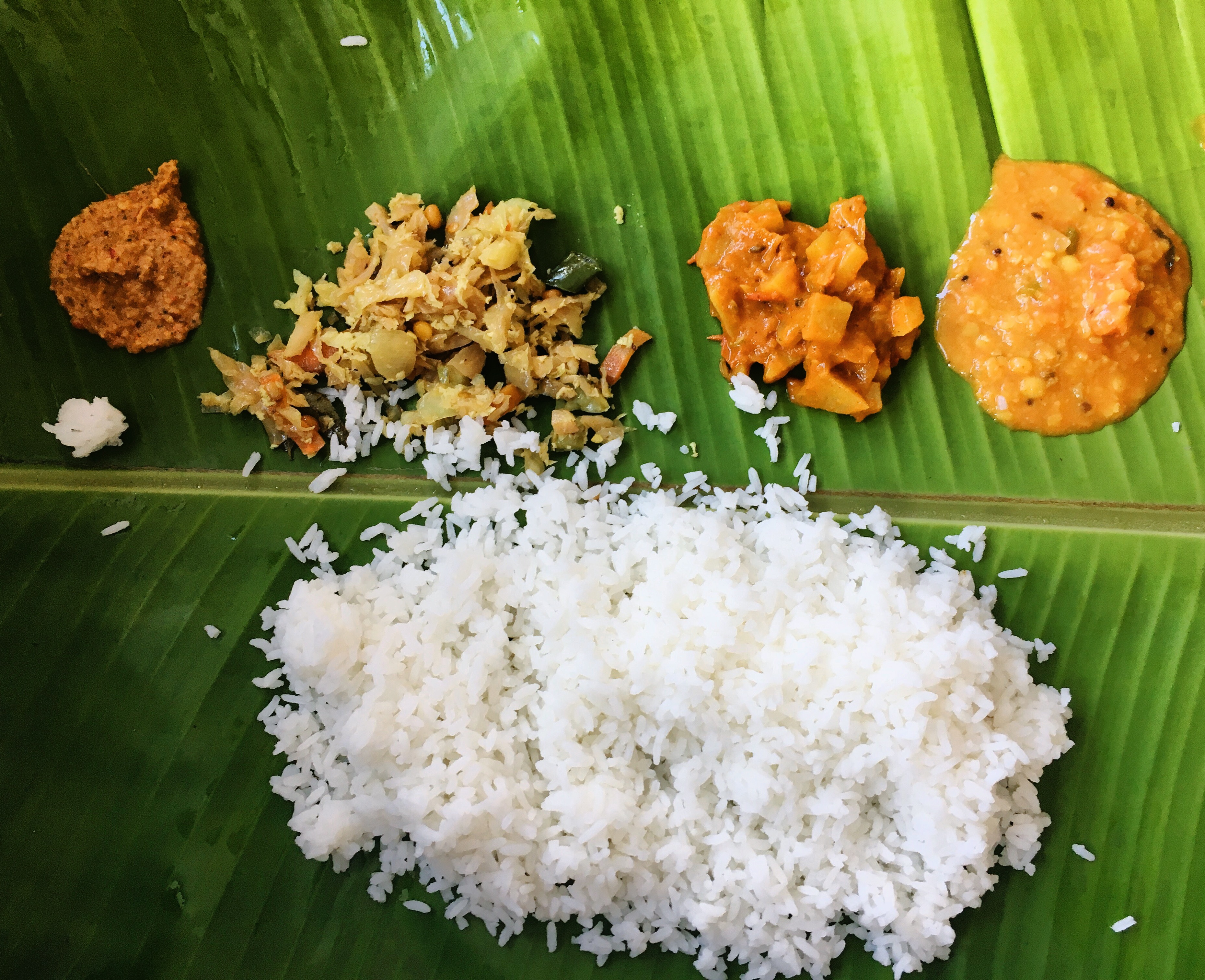 - Thali sur feuille de bananier: On vous sert sur une énorme feuille de bananier: du riz, 3 ou 4 sortes de curry, un peu de pickled mango et un papadam, cette grande croustille épicée. On recevra souvent aussi un petit plat de curd, genre de yogourt, et un dessert. Dans certains endroits, ils feront des remplissages de curry et de riz jusqu’à l’infini, le tout pour souvent moins de 2$ ! Pour une expérience des plus authentiques, on se lave les mains, on enlève ses bagues et on déguste avec la main droite !