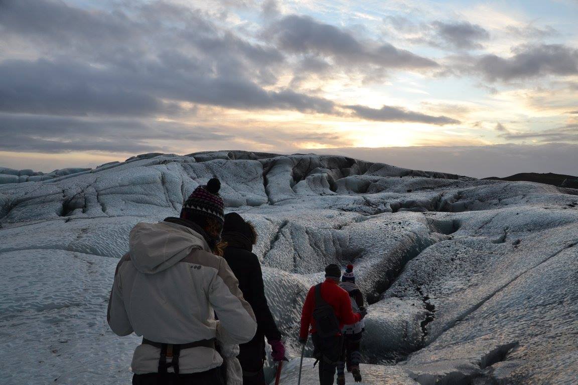 Bon comme vous l’aurez compris, « jökull » signifie glacier. Après un rapide repas, nous enfilons donc nos crampons et partons, avec notre guide, pour une randonnée sur le glacier. Il n’est que 3h de l’après-midi et, pourtant, nous voilà debouts sur un glacier d’Islande les bras ballants, avec nos piolets, à observer un coucher du soleil des plus époustouflants. Le glacier prend les couleurs du ciel. Je n’aurais pas de mots pour vous décrire ce spectacle. Les photos parleront à ma place cette fois, même si jamais elles ne rendront entièrement justice à ce moment…