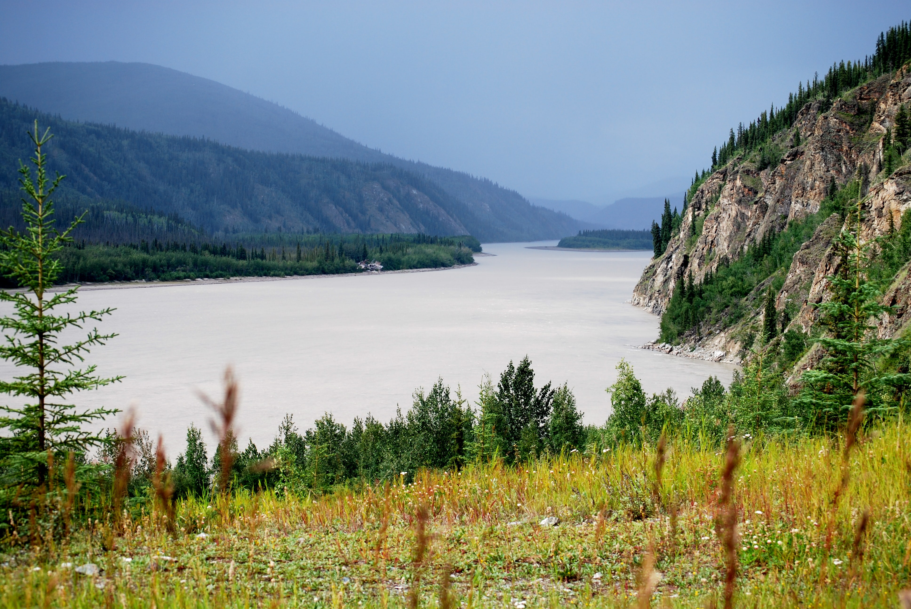 Puis, il y a quelque chose qui se dépose, intérieurement, lorsque l’on aperçoit l’imposante affiche de bois annonçant notre entrée au Yukon : plus grand que nature. C’est la phrase toute indiquée pour préparer les non-initiés, ceux qui n’ont jamais ressenti, à ce jour, le vertige créé par l’immensité indomptée et sauvage du Yukon. C’est magnifique et épeurant à la fois, cela provoque des frissons d’émerveillement comme de peur, à craindre, par moments, dans les ombres et les silences de la brunante, les loups et les grizzlis.