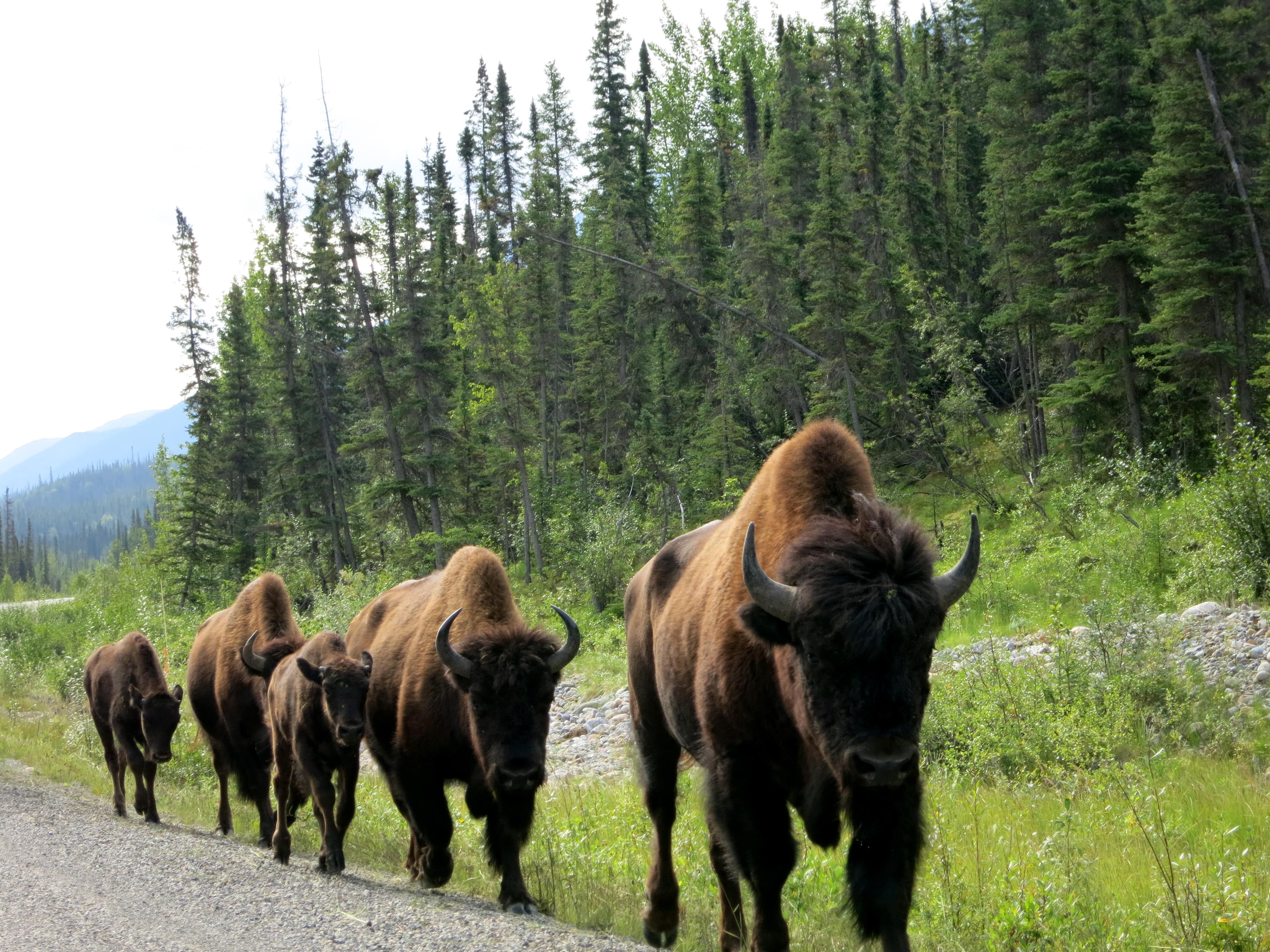 Plus on avance parmi les bois denses de conifères, les feux de forêts du nord de la Colombie-Britannique, les ours qui longent la route, puis les bisons, plus on saisit l’importance d’avoir, dans le coffre, un bidon d’essence de sûreté ainsi qu’un pneu de rechange. Deux éléments que nous avons dû utiliser au cours du voyage.