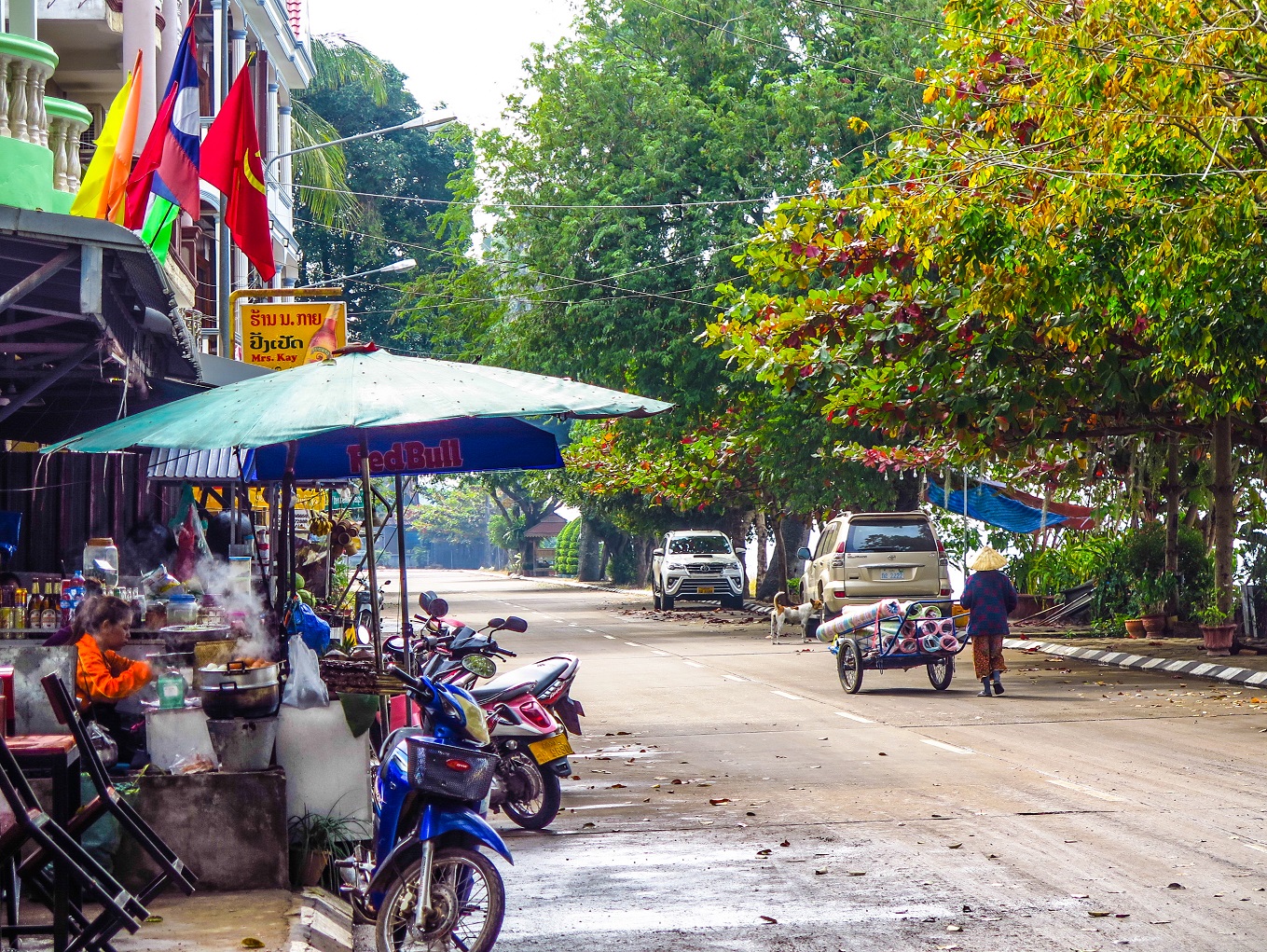 De retour à Thakhek, les fesses quelque peu endolories, nous avons pris un bus jusqu’à Savannakhet. Honnêtement, cet endroit, surtout fréquenté par des touristes en quête de renouvellement de visa, n’offre rien qui vaille particulièrement le détour. Toutefois, j’aime bien découvrir de ces endroits qui n’ont rien de spécial de temps en temps. J’y trouve toujours quelque chose à faire et ce fut le cas à Savannakhet. Premièrement, nous logions au superbe Vivanouk Guesthouse d’où il est très agréable de simplement s’attarder et observer le quotidien des Laotiens. Il est également possible d’y louer des vélos pour se rendre au Wat That Ing Hang, le temple le plus sacré du sud du Laos. En route vers le Wat, il y a plusieurs restaurants locaux répartis dans de petites cabanes construites sur l’eau. Le réseau 4G et Google Images nous ont aidés à commander ce que nous voulions et ce fut une pause très agréable sur le chemin du retour. D’ailleurs, quand je voyage, j’achète toujours une carte sim locale et cela est ultra pratique, que ce soit pour la traduction, se géolocaliser ou utiliser Google Images! Je ne pourrais plus m’en passer. De retour à Savannakhet, en soirée, un petit marché de nuit s’anime sur la place centrale, mais nous avons préféré manger un sin dat, ou barbecue laotien, dans un énorme restaurant qui ne servait que ça. Si vous ne connaissez pas les barbecues asiatiques, il faut remédier à cela lors de votre prochain passage!
