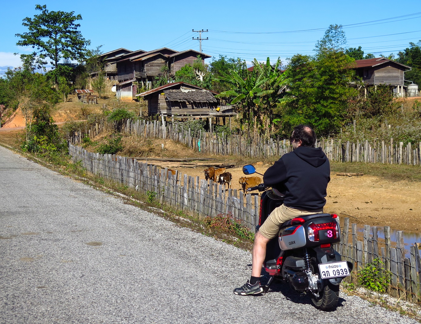 De là, nous avons loué un scooter pour entreprendre ce qu’on appelle The Loop, soit une boucle de 450km qui passe à travers de jolis villages, des formations karstiques spectaculaires, des paysages de montagnes et de rizières, un énorme réservoir, etc. À Thakek, il y a plusieurs endroits où l’on peut louer des scooters et je vous dirais de ne pas lésiner sur la qualité de celui-ci. En effet, nous avons croisé des touristes en panne et étions bien contents d’avoir payé les 4$ supplémentaires qui nous ont permis de rouler sur une moto pratiquement neuve et très confortable, avec de l’espace additionnel sous le siège où nous pouvions déposer pas mal de choses et ainsi éviter de les transporter sur notre dos. À raison de 4-5 heures par jour passées sur la moto, chaque kilo compte. La route qui constitue The Loop est toute asphaltée, il y a peu de circulation et elle se parcourt en trois à cinq jours, ce qui en fait un circuit idéal pour les gens peu familiers avec la conduite en Asie.