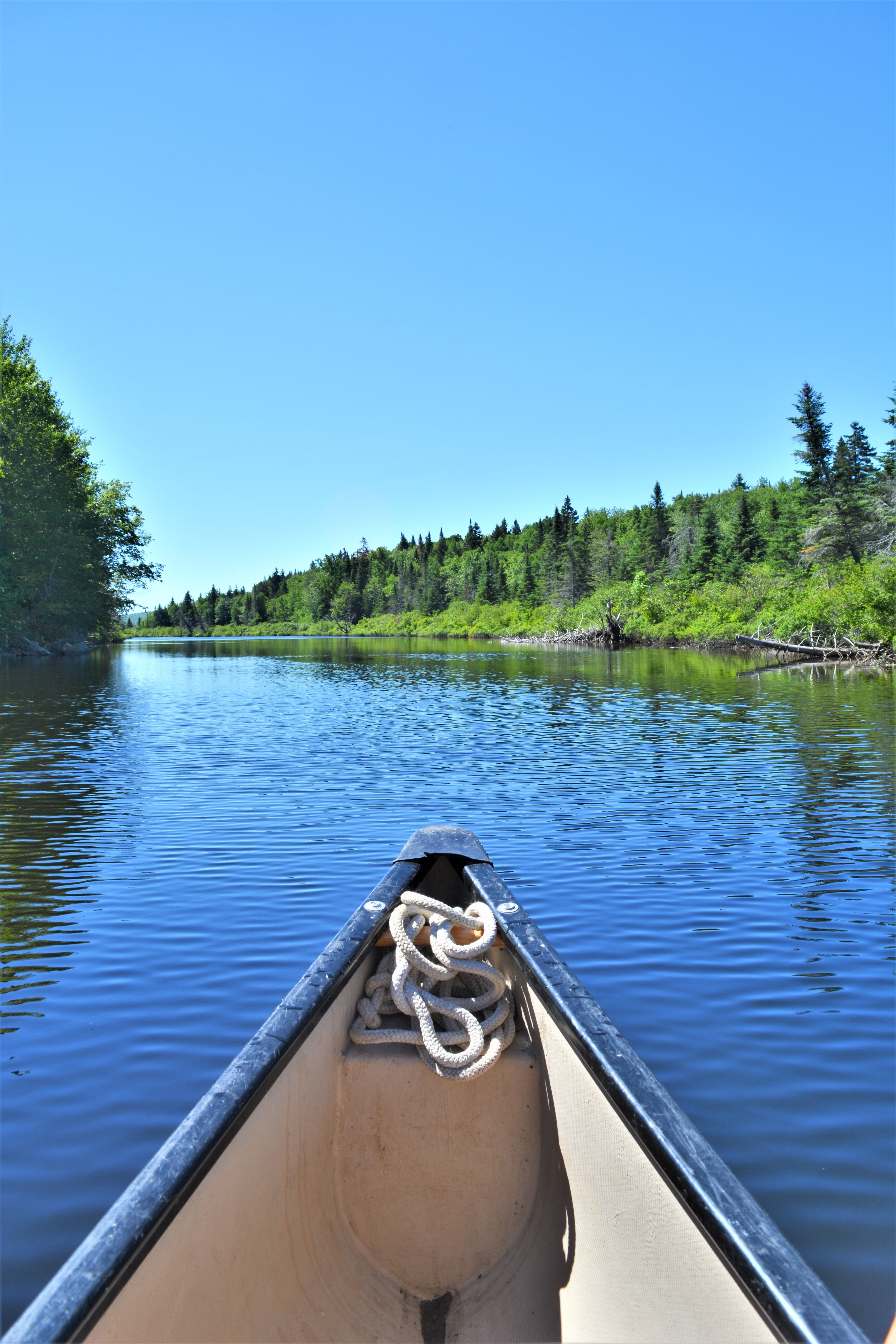 C’est en début d’après-midi que mon mari et moi avons pris possession de notre embarcation dans laquelle nous avons entassé tout l’équipement qui allait nous être utile pour pleinement profiter d’une nuit en forêt et de 2 jours de canot sous le chaud soleil de juin. Notre mission pour la première journée était de naviguer au travers du lac Long et de la rivière noire représentant un peu plus de 6 km.