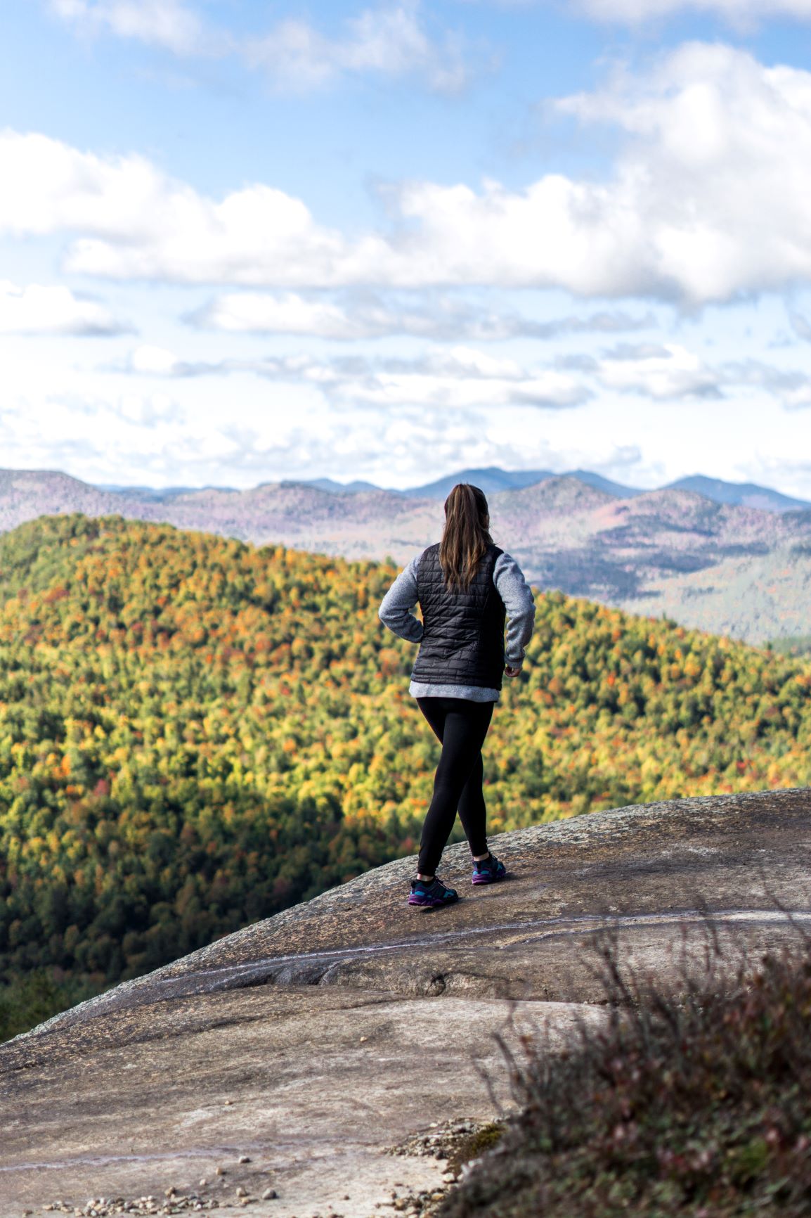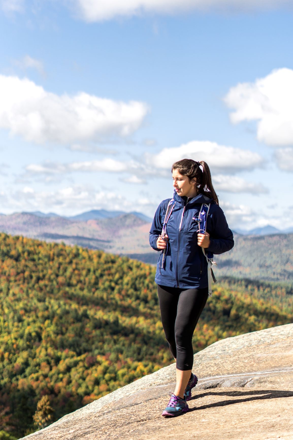 - Lorsque nous avons atteint le sommet de Poke-O-Moonshine, j’étais bien heureuse de pouvoir ajouter le manteau Stretch Rainshadow par dessus le Nano Puff pour ainsi avoir une meilleure protection contre le vent. De plus, celui-ci prend très peu d’espace et est donc très facile à ranger dans un sac à dos.