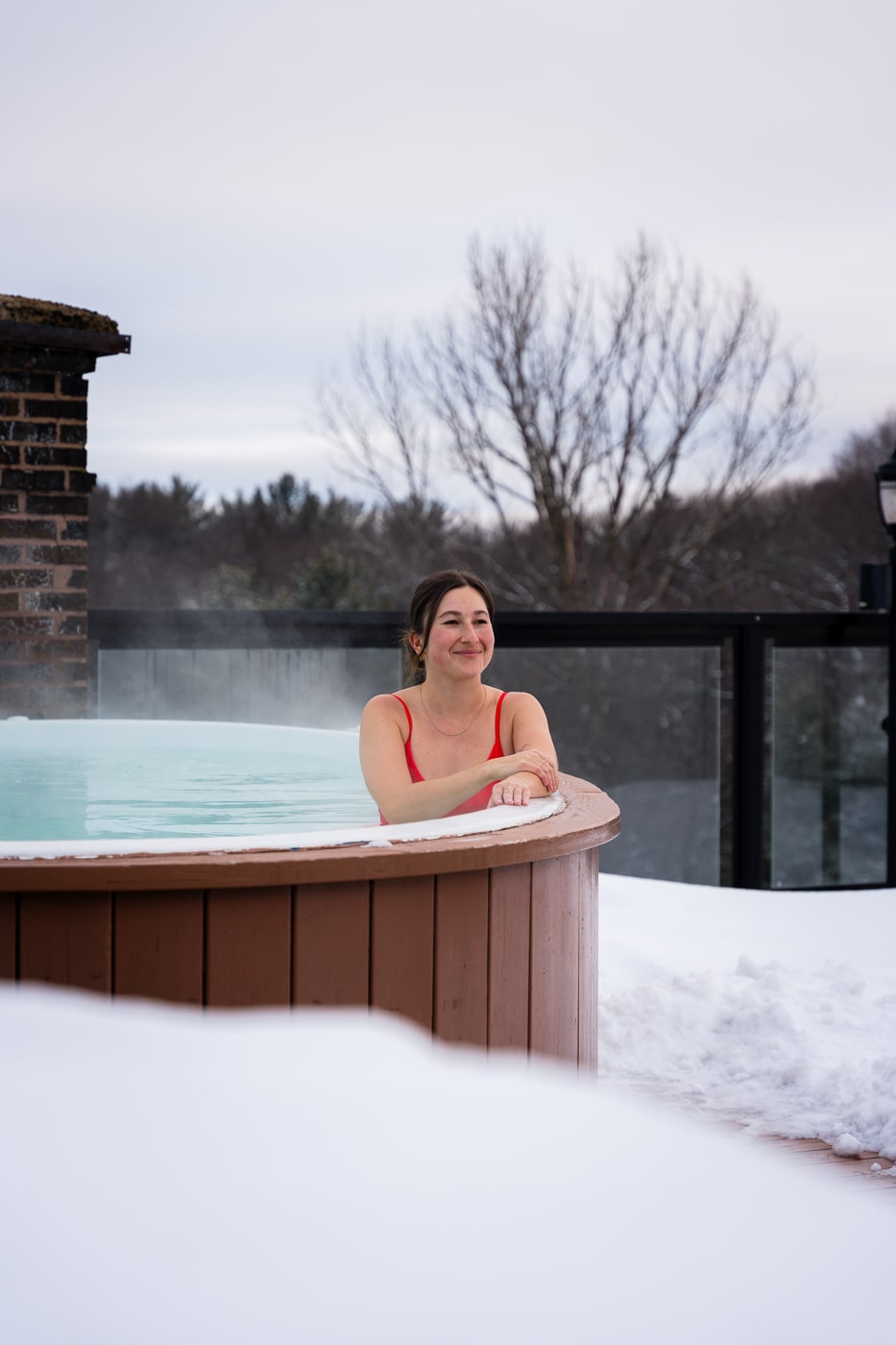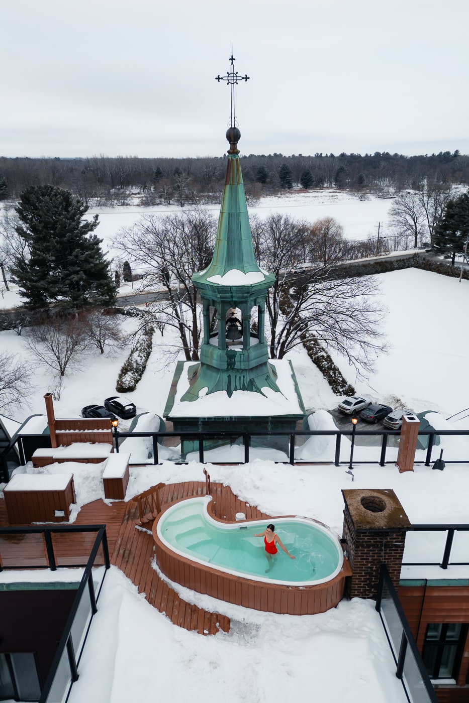 Sur le site de l’hôtel se trouvent des bains chauds et froid extérieurs ainsi qu’un sauna sec qui offrent le cadre parfait pour se détendre! À l’intérieur, vous pourrez également profiter d’une salle de détente ou réserver soins et massothérapie. Si cela n’était pas déjà suffisant, mon coup de cœur personnel est le bain chaud qui se trouve sur la terrasse tout en haut de l’hôtel. Oui, sur le toit! Difficile de demander mieux pour un moment de détente intime. Je vous propose un bain chaud sous les étoiles ou encore au coucher du soleil pour en profiter au maximum. Pour une escapade en famille, vous pourrez aussi opter pour la piscine et le bain à remous intérieurs!